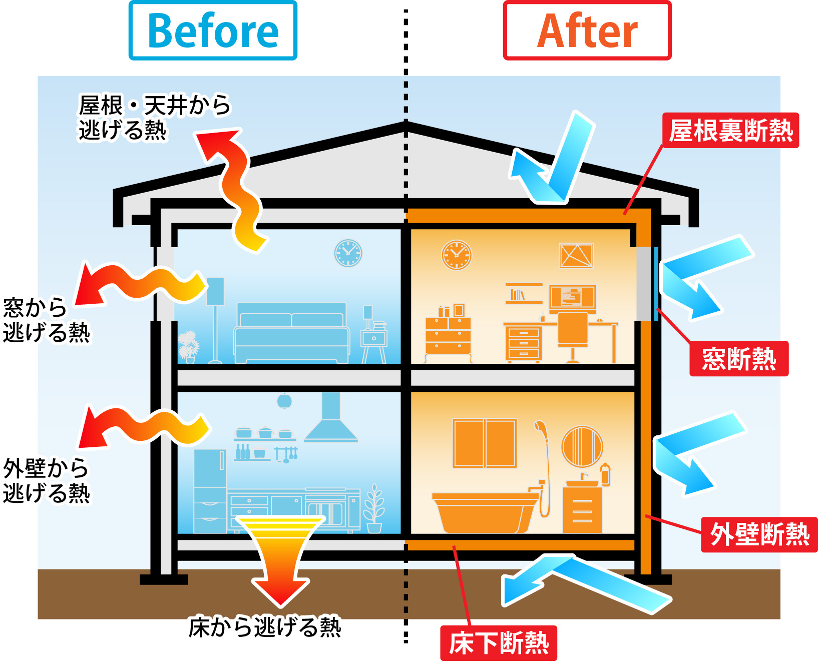 室内側と室外側の熱意童を遮断して外気温が室内に伝わりにくくすることも断熱材の役割です。