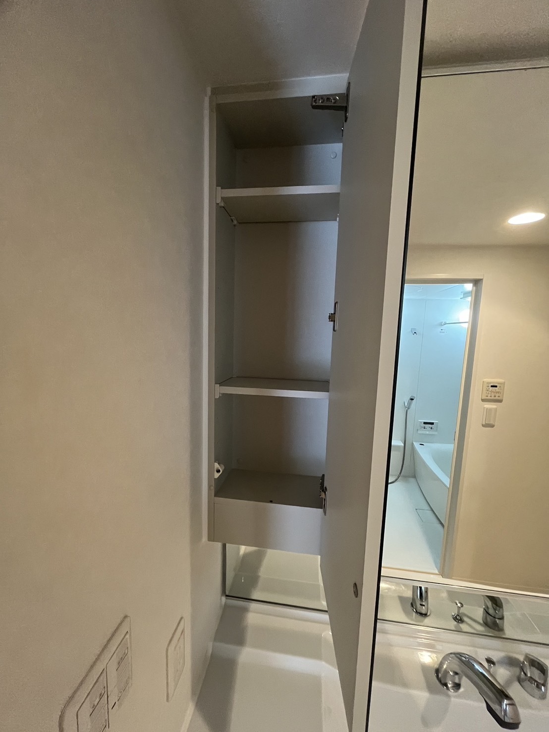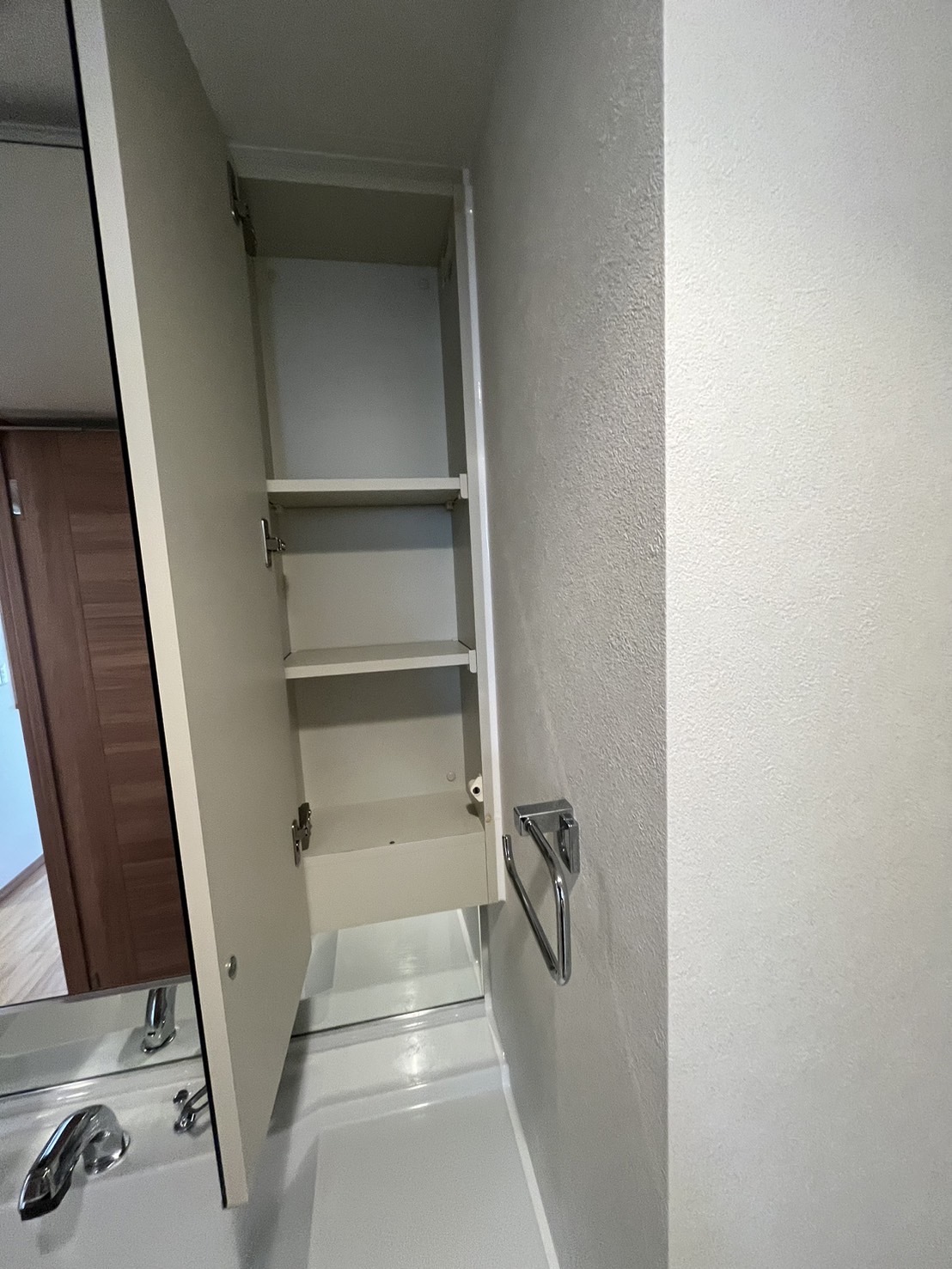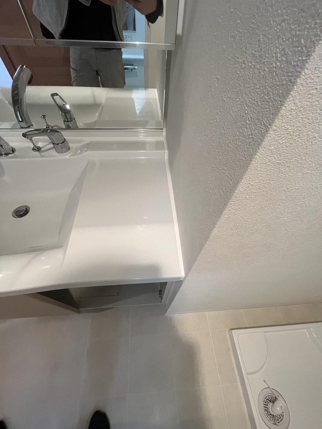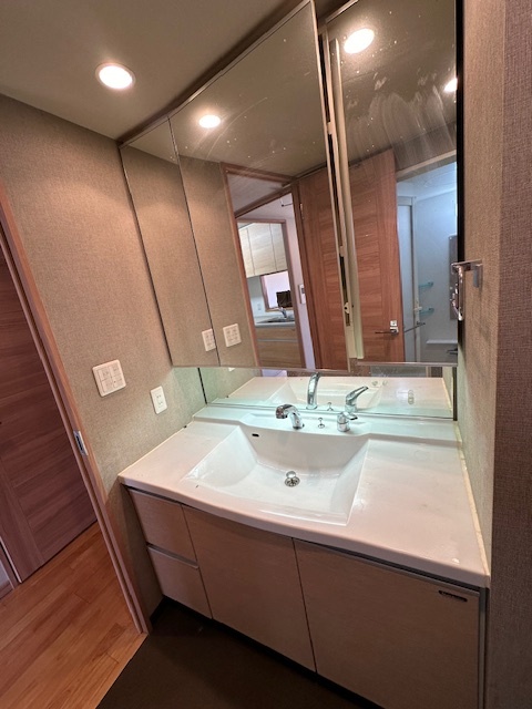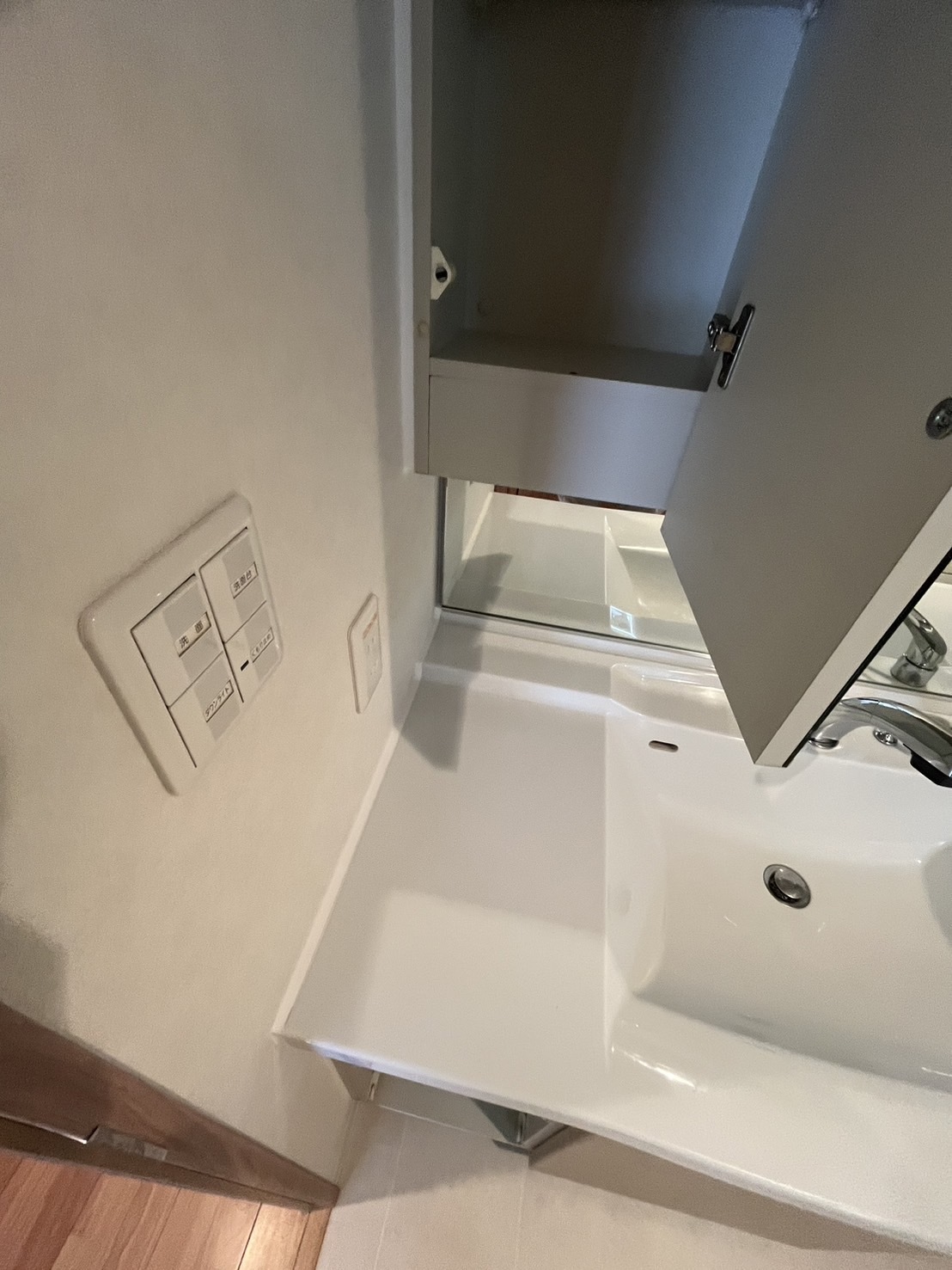 先日洗面所のクロスの張替えを行いその際に洗面化粧台の美装と