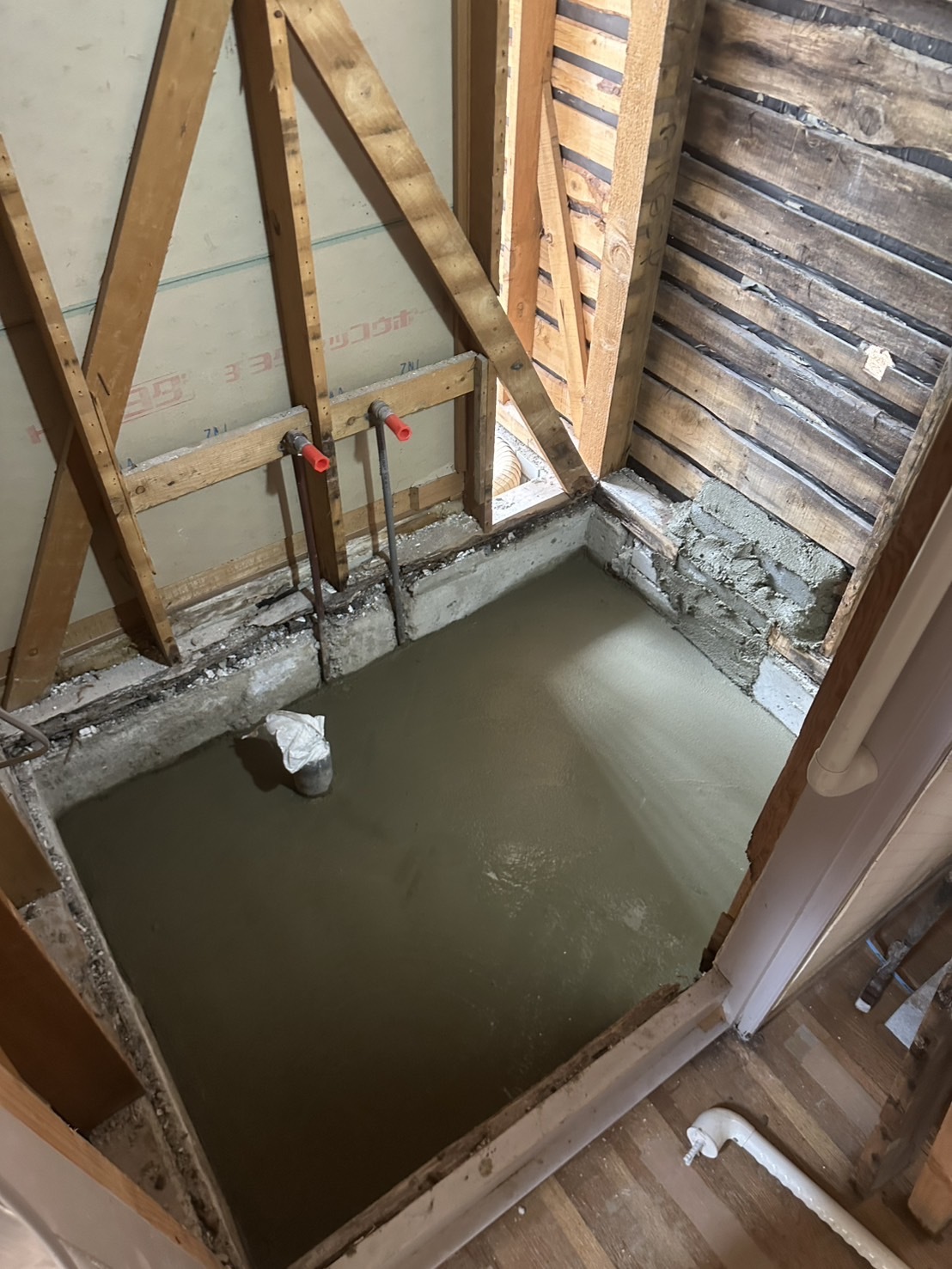 土間打ちとは、ユニットバスやシステムバスを設置する際に、土台となるコンクリートを打つ工事です☆