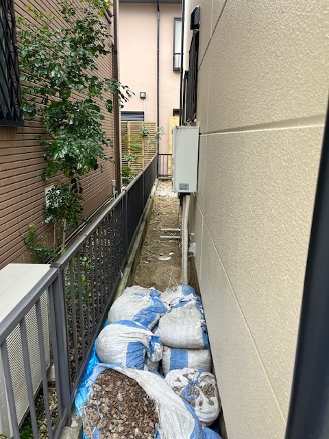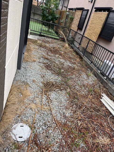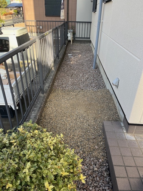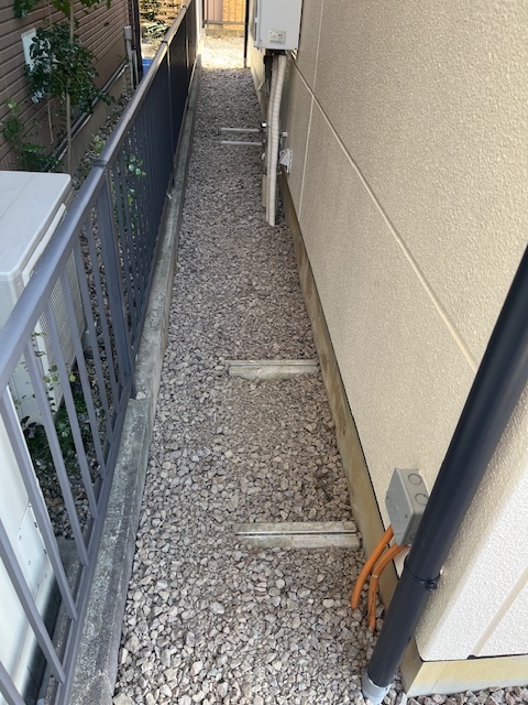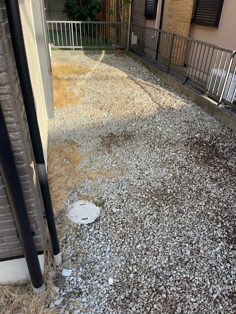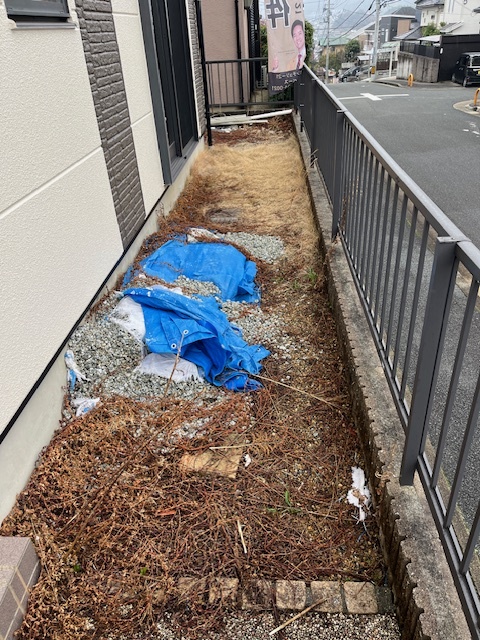 先日リフォーム現場の家周りの雑草を抜いて、砕石をまきました!